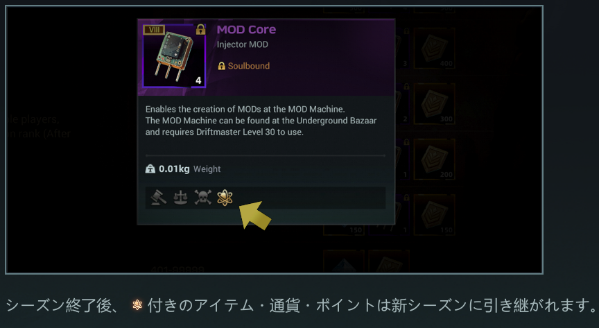 シーズン引き継ぎアイコンが付いているものは、新シーズンに引き継がれます。